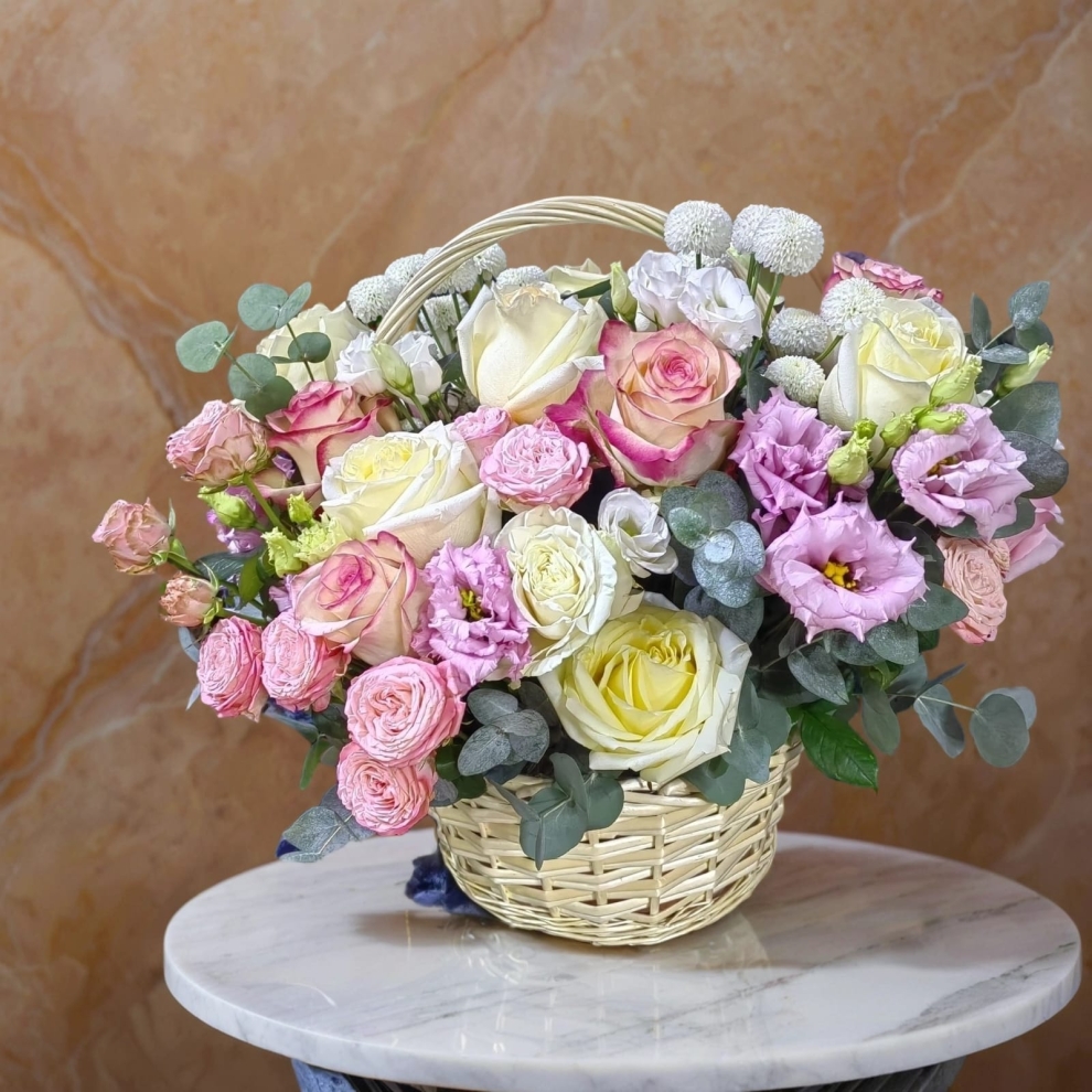 Премиум корзина из белых пионовидных эквадорских роз канделайт и феникс, пионовидных кустовых роз, эустомы и эвкалипта покорит Ее сердце!
