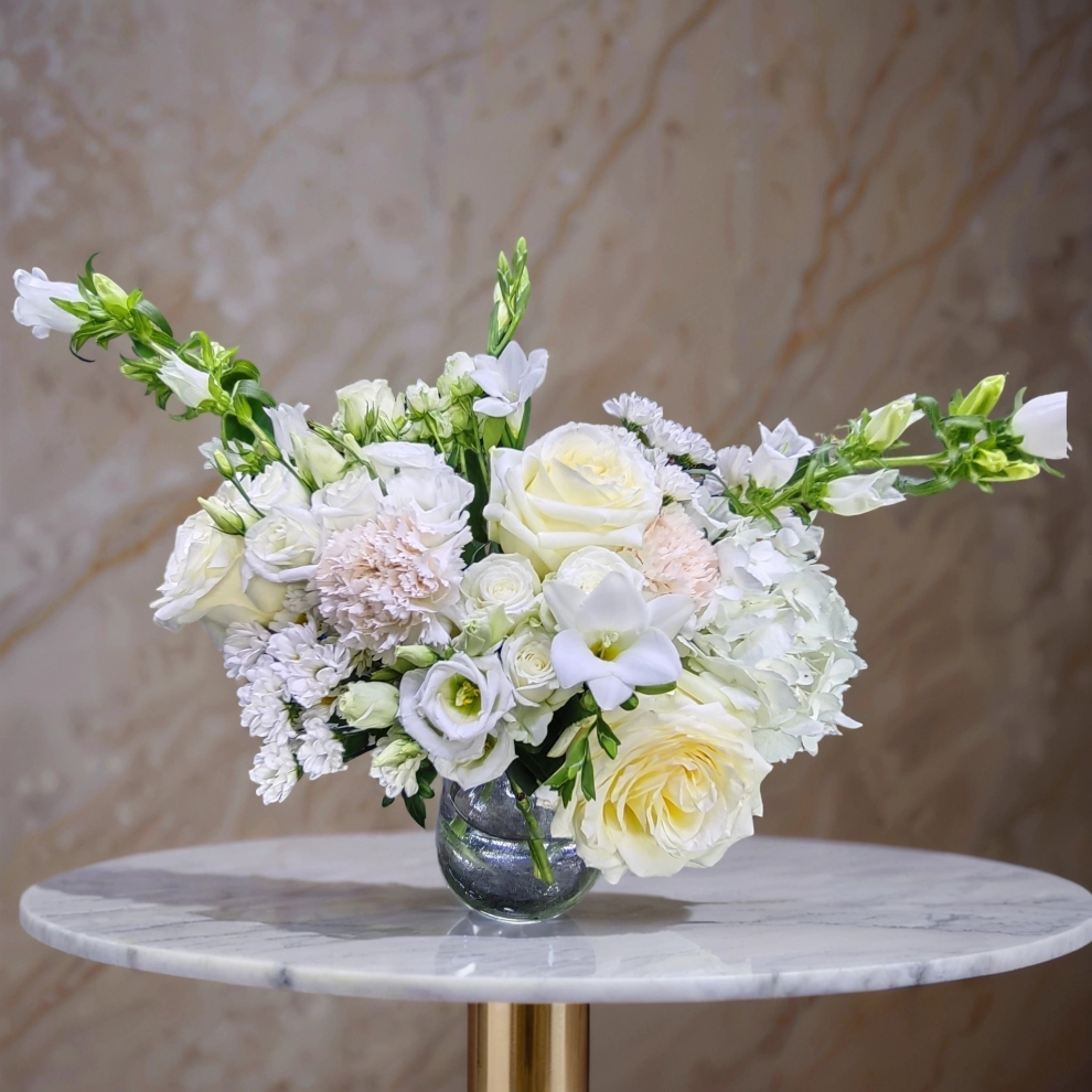 Нежнейший букет из пионовидных эквадорских роз канделайт, белой эустомы, белой кампанулы ( итальянский колокольчик), фрезии и нежных диантусов для самой нежной Девушки!