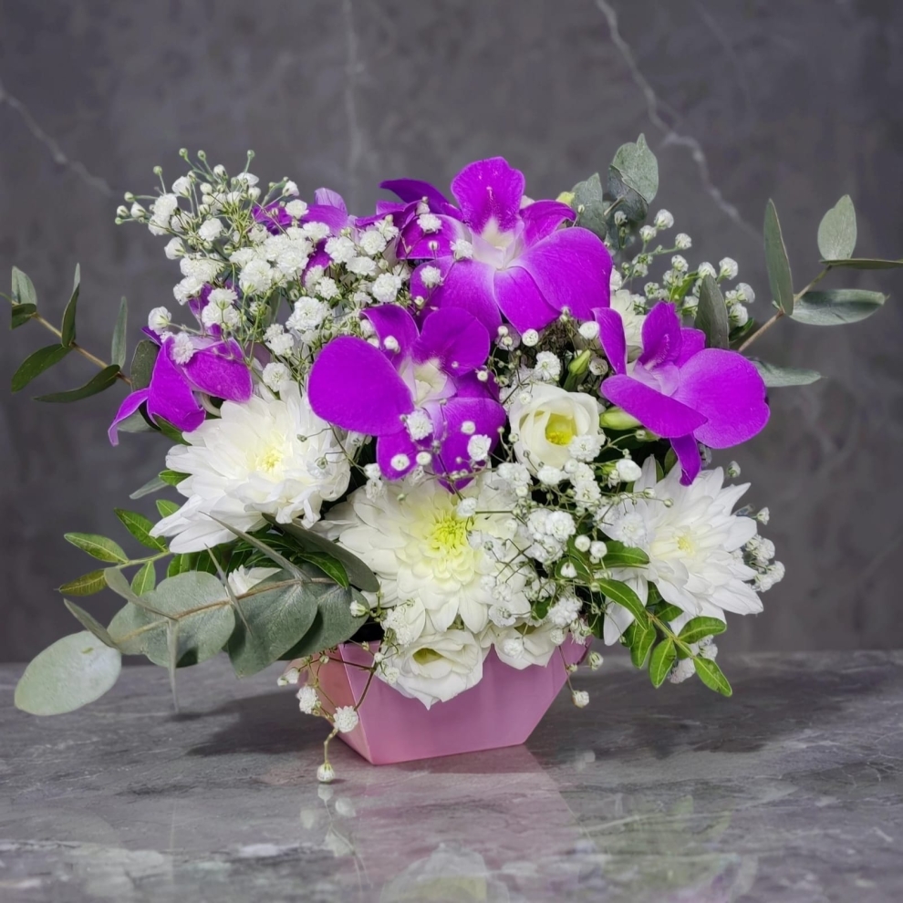 Небольшая, но эффектная композиция в сумочке ( внутри флористическая влажная губка, позволяющая цветам стоять дольше, чем в вазе ( надо периодически подливать воду) - с орхидеей Ванда, белой кустовой хризантемой, белой гипсофилой, и эвкалиптом.