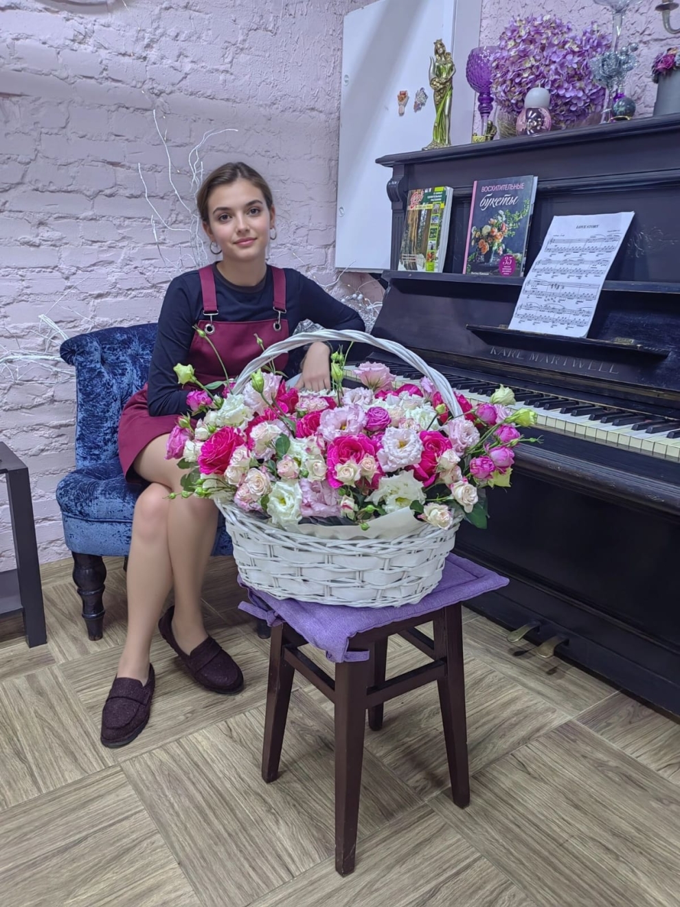 Огромная корзина Дуо во флористической губке ( удобно! не надо искать вазу!) из 51й ароматной эквадорской роыз пинк флойд и махровой белой и розовой эустомы ( лизиантуса)